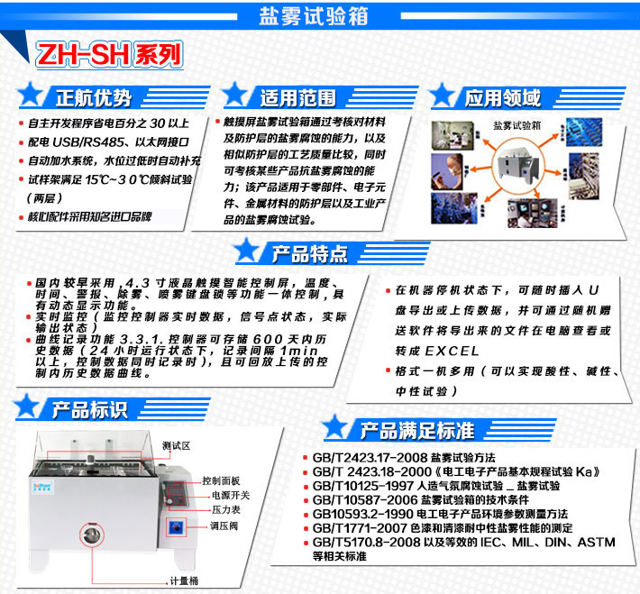 正航鹽霧試驗箱是采用鹽霧腐蝕的方式來檢測被測樣品的分別耐腐蝕的可靠性,鹽霧是指大氣中由含鹽微小液滴所構成的彌散系統(tǒng),是人工環(huán)境三防系列中的一種,很多企業(yè)產品需模擬海洋周邊氣候對產品造成的破壞性,所以鹽霧試驗箱應運而行。鹽霧試驗分為中性鹽霧和酸性